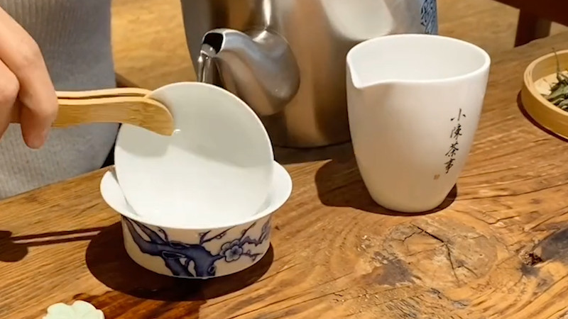 之后可使用茶匙将8g肉桂茶投入盖碗中,茶水比例控制在1:15左右,肉桂茶的投茶量与普通茶相比要多一些,一般110毫升的盖碗,投放8g茶叶能达到较好的冲泡效果。若拿捏不好重量,冲泡前可使用电子秤进行称量。