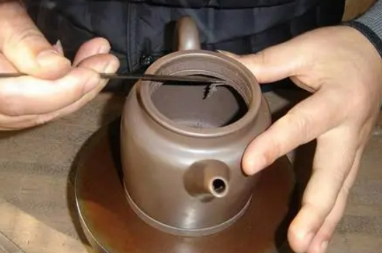 若是紫砂壶壶口不密封,就需整修壶盖和壶口。首先把肥皂抹在壶盖的边沿处,然后抹上用水调均匀的金刚砂,最后一只手拿着壶底,另一只手拿着壶盖,往相反方向来回轻磨。