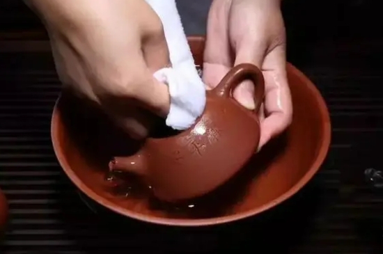 泡茶之前,可以先用热水冲淋紫砂壶内外,起到杀菌、暖壶的目的。然后趁热用布擦拭壶身,使壶壁更加光亮。泡茶时勿将紫砂壶浸入水中,泡完茶后要及时倒掉茶渣,用热水冲去残留在壶身的茶汤。