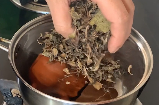 接着继续把铁锅中的水换掉,并投入新紫砂壶日后所要冲泡的茶叶煮15分钟,随后关火晾凉,让紫砂壶充分吸收汤汁,以泡出滋味更适口的茶汤。