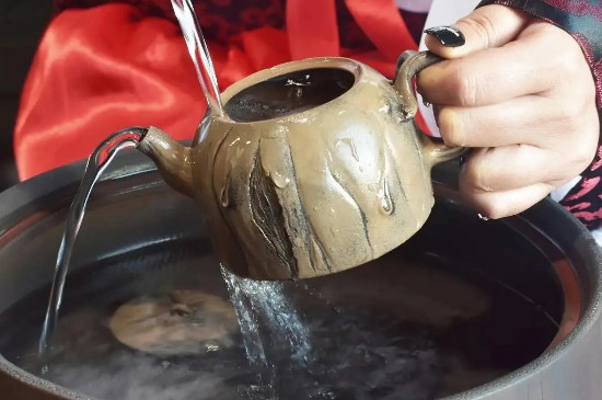 陶壶洗过之后,准备一个干净的平底锅,倒入适量的水加热,水沸腾翻滚后,将陶壶放入锅中,再加入适量的茶叶,烹煮20-30分钟,使陶壶吸收茶叶的香味。