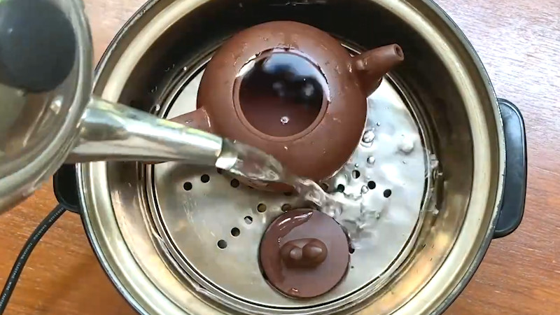 新的紫砂壶开壶时,先将茶壶放入清水中浸润,然后备一口干净、无油的锅,锅中注入冷水,接着把紫砂壶放入,开火烹煮半个小时,这时不要着急拿出,让茶壶浸泡10分钟后捞出。