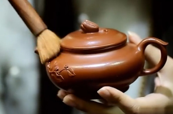 煮好后的紫砂壶需进行清洗,准备一把软毛养壶笔,先用水打湿,然后沿着茶壶外壁缓缓刷动,将外层的灰尘、砂质清洗干净,之后再伸入茶壶内壁,用力刷洗,以保证整个茶壶的清洁。