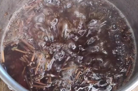 随后往干净的奶锅中加入适量清水烧开,接着放入茯砖茶的茶块,用小火煮5分钟,然后把火关掉,焖4~5分钟,让茶汤颜色逐渐变得深红。