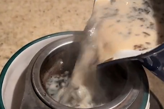 接下来把鲜牛奶倒入奶锅中,开火煮至冒泡,随后加入少许的盐、红糖、葡萄干等进行调味,一边煮一边用木铲搅拌,将奶茶搅拌均匀后用过滤碗盖住杯口,倒入奶茶饮用。