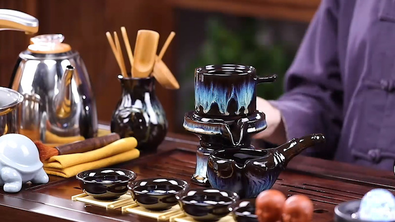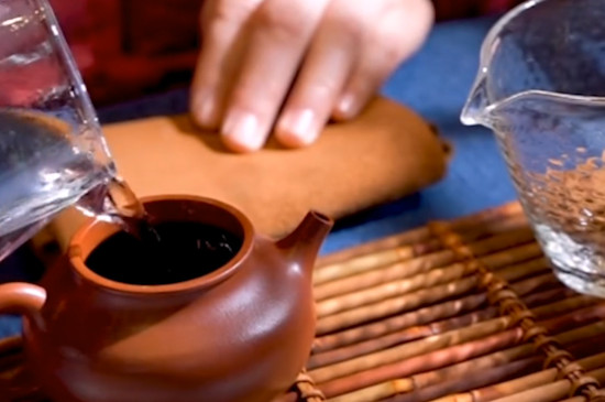 洒茶时需先将茶杯依次码放好,提起茶壶,以“高冲低斟”的方式将茶汤注入茶杯中,并且速度要快,以保持茶汤热度,同时也要让每杯茶中的茶汤色泽一致。