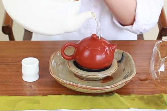 接下来把茶壶放在茶洗里,提起茶铫,将沸水浇淋在茶壶上,让热气内外夹攻,逼使茶香迅速挥发,追加热气,冲去壶外茶沫,等茶壶上的水分全干后取出。