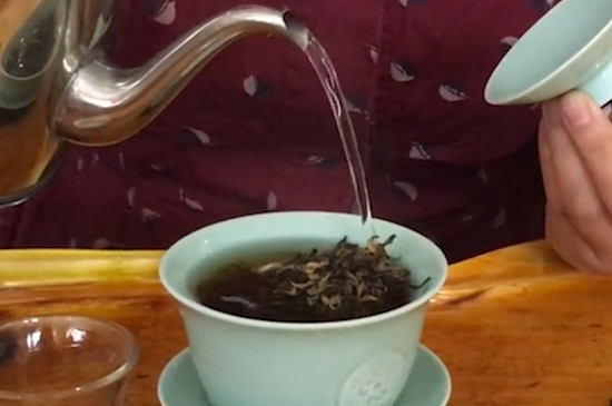 接着取出玻璃杯,用茶匙把3~5g茶叶投入玻璃杯中,注入适合冲泡此茶水温的开水冲泡,并用茶匙快速搅拌茶汤,3~7秒后倒掉茶汤,去除茶叶中的脏污。