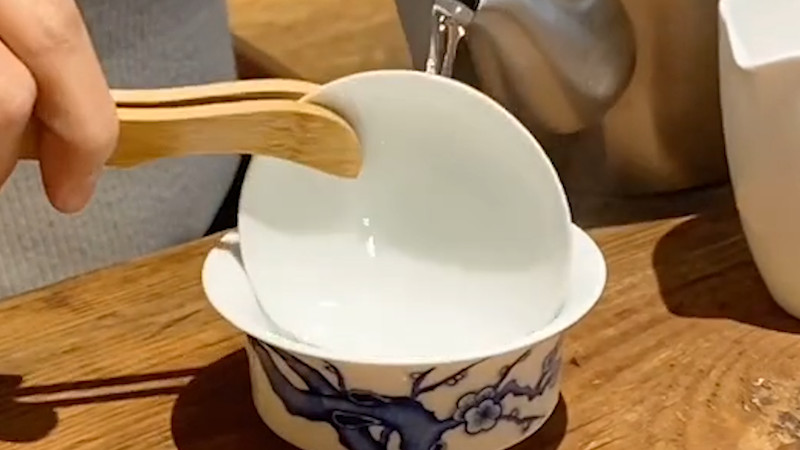 洗杯之后,准备3-5克黄金茶放入水杯中,然后手持茶壶,立于茶杯的上方缓缓倒水,使水流冲动茶叶,以保证黄金茶充分浸润。注意黄金茶较为鲜嫩,可以直接冲泡,不需进行洗茶这一步骤。