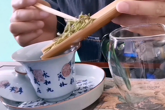 先用茶夹在茶叶罐中取适量的黄金芽茶叶放入茶荷中,慢慢欣赏茶叶的外形,然后用茶匙再将茶叶从茶荷拨入水杯中,具体投茶量以铺满茶杯底部为佳,过多冲泡不开,过少茶汤寡淡。
