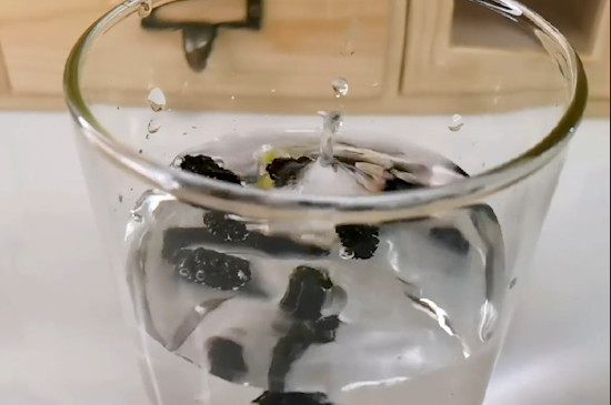 在用桑葚干泡水时,先准备一个干净、透明的玻璃杯,保持杯内干爽,接着用茶夹取3-5克桑葚干,将其放入温水中稍加清洗,以清除表面的灰尘,然后将水倒掉,桑葚干留在杯内备用。