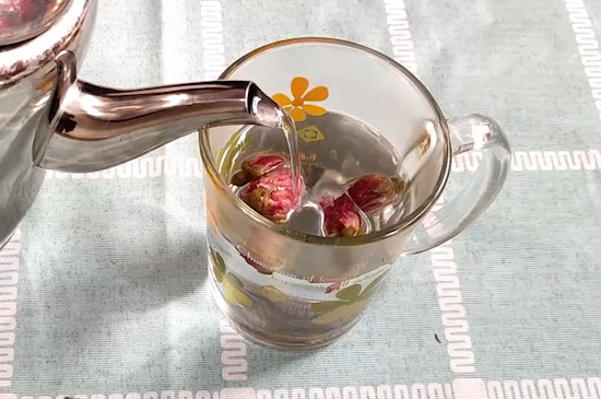 准备一个玻璃杯,先放入3-5朵干玫瑰花,接着倒入少量的热水润茶,使玫瑰花微微浸润,然后把水倒掉,再次往杯中注入沸水,水量以七分满为宜,倒水完成后放入3-4片柠檬,闷泡5分钟即可。