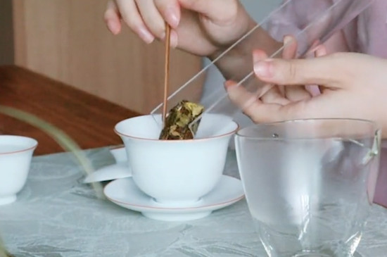 1、备具,取出一个干净的白瓷盖碗,倒入沸水进行烫洗;2、置茶,拿出一块完整的漳平水仙茶,直接放入盖碗中,冲入少量的沸水洗茶;3、冲泡,茶叶微微浸润后,提起水壶,对着碗中心高冲,让茶叶随之翻腾,之后盖上碗盖闷泡20秒。