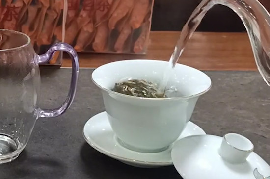 温洗茶具之后,取一块漳平水仙茶,不需将其掰碎,直接投入盖碗中即可,接着提起水壶往碗中倒入热水,浸润3-5秒后快速将水倒掉,此过程是为了洗茶,以去除水仙茶中的杂质和灰尘。