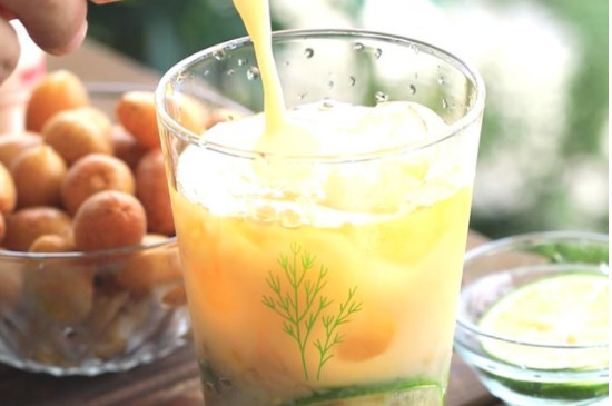 往杯中加入冰块,倒入冷却好的茶汤,茶汤倒至杯子的三分之二处,再倒入养乐多。雪克杯盖好充分摇晃,使杯中的的黄皮、茶汤、养乐多混合均匀。黄皮果茶倒入玻璃杯中,用薄荷叶装饰。没有养乐多可以用糖浆、蜂蜜或白糖替代。