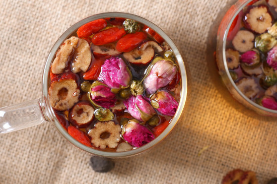 在茶具里放入适量的枸杞,可以根据自己的口味加入少量的红枣,再加一些玫瑰花茶,向里面倒入70度左右的温水,焖泡2~3分钟就可以了。