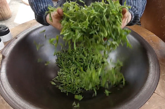 茶叶的理条方式有抓条和甩条两种,抓条时需将手心向下,拇指稍张开,其余四指并拢,将茶叶从小指顺沿锅壁带人手中抓揉成条,让茶叶条索逐渐变得紧密起来。