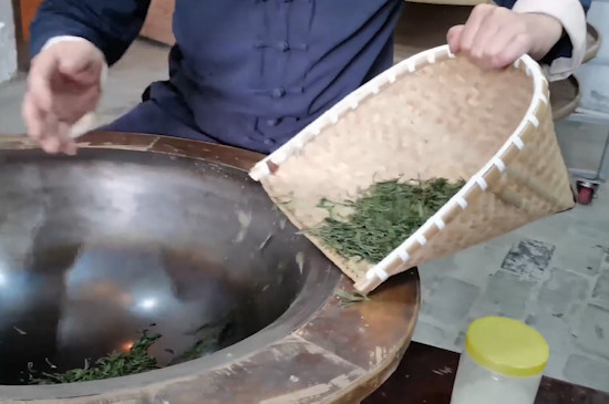 茶叶在理条过程中,抓条和甩条需反复交替进行,直到茶叶8成干时出锅。理条时需将茶叶抓得匀、甩得开、摆得直,手势先“松、高、轻、慢”,再“紧、低、重、快”,让条索匀整。