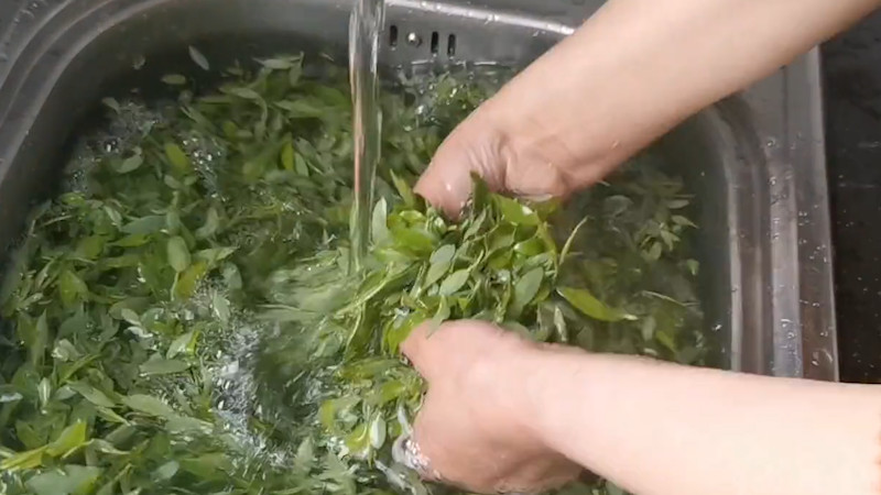 茶叶在炒制时,先将已经采摘好的茶叶均摊在竹匾上,去掉茶叶中的老叶、残叶、茶梗等,接着将茶叶浸泡在清水中,把茶叶上的脏污尽数清洗干净。