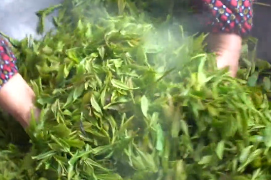 接下来用双手反复抓揉茶叶,将茶汁揉出来后再次放回热锅中炒,此时翻炒温度需控制在90℃,让茶叶在炒制过程中逐渐卷曲,并散发出淡淡的茶香,30分钟后取出茶叶晾凉即可。