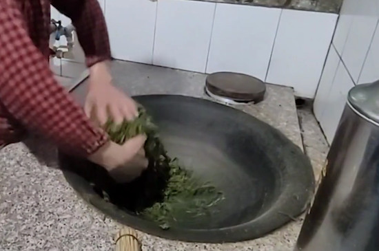 把一口干净的铁锅放在柴火灶台上,烧柴将铁锅加热,随后倒入已经晒好的茶叶,顺时针快速翻炒3分钟,手法要从下往上,炒好后把茶叶盛入簸箕中,趁热揉搓茶叶,直到有茶汁溢出后继续揉10分钟,重新放回铁锅里炒。
